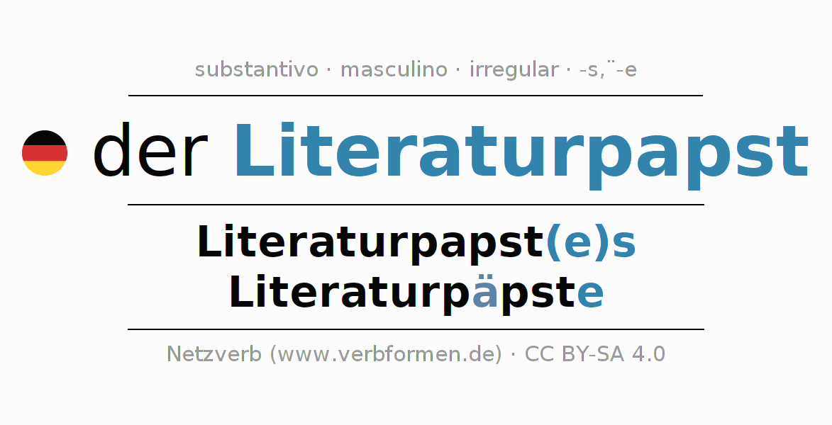 A declinação do substantivo Literaturpapst (crítico literário influente) está no genitivo singular Literaturpapst(e)s e no nominativo plural Literaturpäpste . O substantivo forte Literaturpapst é declinado com a terminação es/ä-e. No plural com um trema. O gênero gramatical de Literaturpapst é masculino e o artigo definido é 'der'. Não se pode somente declinar o substantivo Literaturpapst mas sim todos os substantivos em alemão. Comentários ☆