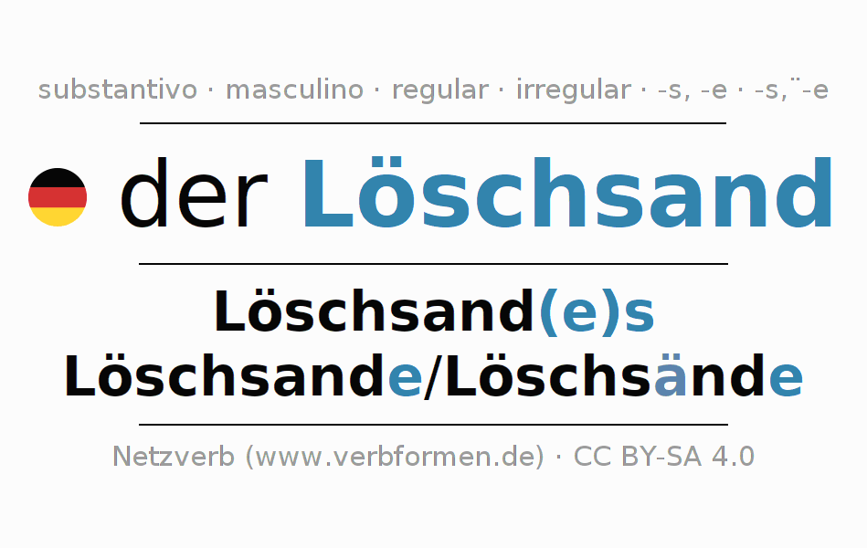 A declinação do substantivo Löschsand (areia de combate a incêndios) está no genitivo singular Löschsand(e)s e no nominativo plural Löschsande/Löschsände . O substantivo forte Löschsand é declinado com a terminação es/e/ä-e. No plural com um trema. O gênero gramatical de Löschsand é masculino e o artigo definido é 'der'. Não se pode somente declinar o substantivo Löschsand mas sim todos os substantivos em alemão. Comentários ☆