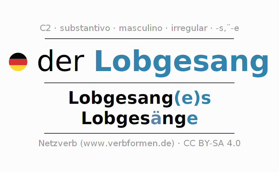 Declinação de Lobgesang é apresentada em uma tabela com todas as formas no singular e no plural (plural) e em todos os quatro casos: nominativo (1º caso), genitivo (2º caso), dativo (3º caso) e acusativo (4º caso) . Especialmente para os alunos de alemão, a correta declinação da palavra Lobgesang é fundamental.