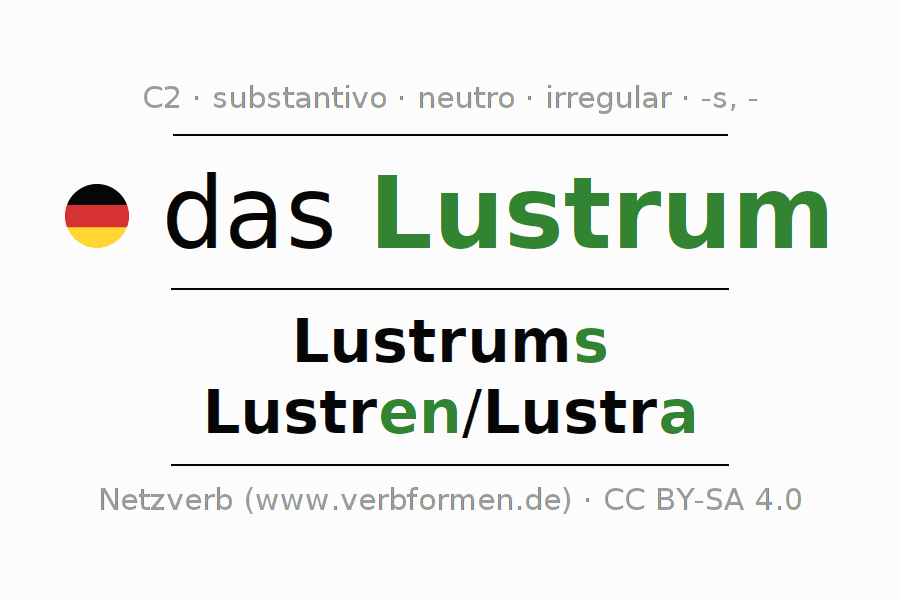 A declinação do substantivo Lustrum (lustro, período de cinco anos) está no genitivo singular Lustrums e no nominativo plural Lustren/Lustra . O substantivo Lustrum é declinado com as terminações s/en/a. O gênero gramatical de Lustrum é neutro e o artigo definido é "das". Não se pode somente declinar o substantivo Lustrum mas sim todos os substantivos em alemão. O substantivo faz parte do vocabulário referente ao Certificado em Alemão do Nível C2. Comentários ☆