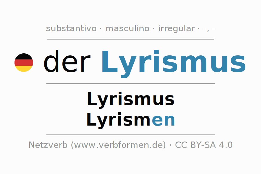 A declinação do substantivo Lyrismus (lirismo) está no genitivo singular Lyrismus e no nominativo plural Lyrismen . O substantivo Lyrismus é declinado com as terminações -/en. O gênero gramatical de Lyrismus é masculino e o artigo definido é 'der'. Não se pode somente declinar o substantivo Lyrismus mas sim todos os substantivos em alemão. Comentários ☆