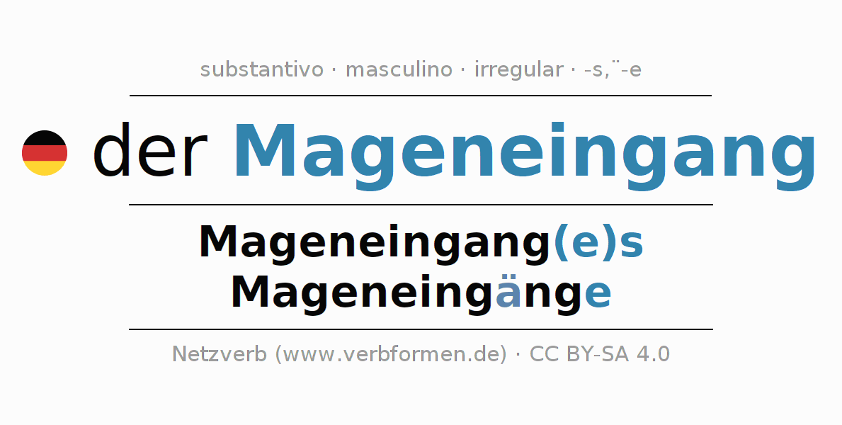 A declinação do substantivo Mageneingang (cardia) está no genitivo singular Mageneingang(e)s e no nominativo plural Mageneingänge . O substantivo forte Mageneingang é declinado com a terminação es/ä-e. No plural com um trema. O gênero gramatical de Mageneingang é masculino e o artigo definido é 'der'. Não se pode somente declinar o substantivo Mageneingang mas sim todos os substantivos em alemão. Comentários ☆