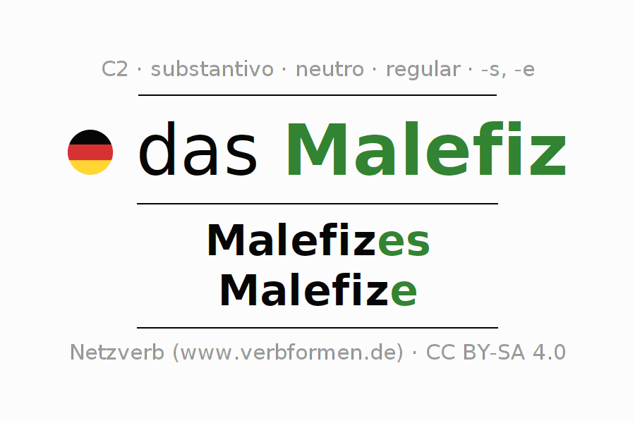 Declinação de Malefiz é apresentada em uma tabela com todas as formas no singular e no plural (plural) e em todos os quatro casos: nominativo (1º caso), genitivo (2º caso), dativo (3º caso) e acusativo (4º caso) . Especialmente para os alunos de alemão, a correta declinação da palavra Malefiz é fundamental.
