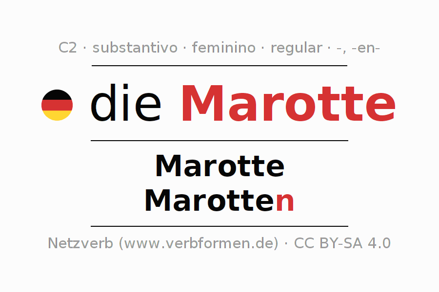 A declinação do substantivo Marotte (capricho, mania) está no genitivo singular Marotte e no nominativo plural Marotten . O substantivo fraco Marotte é declinado com a terminação -/n. O gênero gramatical de Marotte é feminino e o artigo definido é "die". Não se pode somente declinar o substantivo Marotte mas sim todos os substantivos em alemão. O substantivo faz parte do vocabulário referente ao Certificado em Alemão do Nível C2. Comentários ☆
