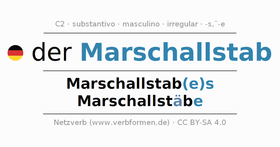 Declinação de Marschallstab é apresentada em uma tabela com todas as formas no singular e no plural (plural) e em todos os quatro casos: nominativo (1º caso), genitivo (2º caso), dativo (3º caso) e acusativo (4º caso) . Especialmente para os alunos de alemão, a correta declinação da palavra Marschallstab é fundamental.