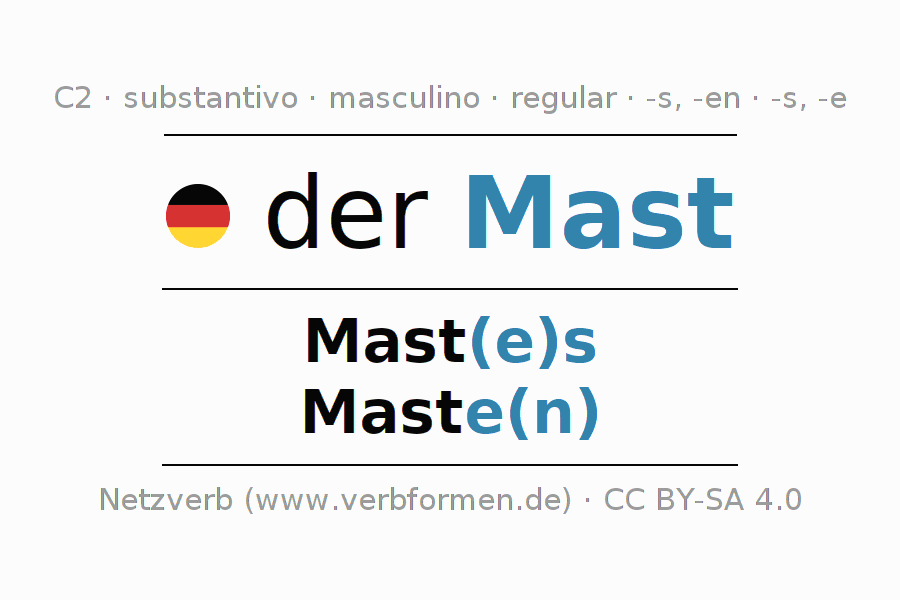 Declinação de der Mast é apresentada em uma tabela com todas as formas no singular e no plural (plural) e em todos os quatro casos: nominativo (1º caso), genitivo (2º caso), dativo (3º caso) e acusativo (4º caso) . Especialmente para os alunos de alemão, a correta declinação da palavra der Mast é fundamental.