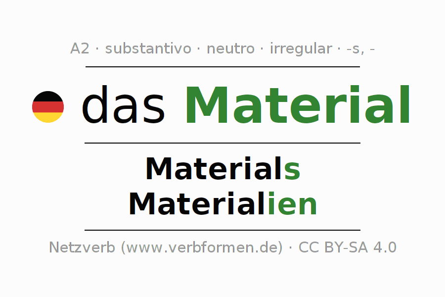 Declinação de Material é apresentada em uma tabela com todas as formas no singular e no plural (plural) e em todos os quatro casos: nominativo (1º caso), genitivo (2º caso), dativo (3º caso) e acusativo (4º caso) . Especialmente para os alunos de alemão, a correta declinação da palavra Material é fundamental.