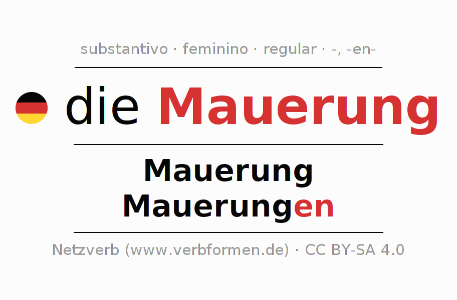 Declinação de Mauerung é apresentada em uma tabela com todas as formas no singular e no plural (plural) e em todos os quatro casos: nominativo (1º caso), genitivo (2º caso), dativo (3º caso) e acusativo (4º caso) . Especialmente para os alunos de alemão, a correta declinação da palavra Mauerung é fundamental.
