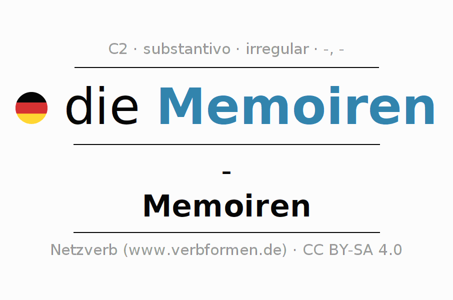 A declinação do substantivo Memoiren (memórias, memórias escritas) está no genitivo singular - e no nominativo plural Memoiren . O substantivo Memoiren é declinado com as terminações /-. Não há formas no singular. O substantivo também pode ser usado com outros géneros e outros artigos. Não se pode somente declinar o substantivo Memoiren mas sim todos os substantivos em alemão. O substantivo faz parte do vocabulário referente ao Certificado em Alemão do Nível C2. Comentários ☆