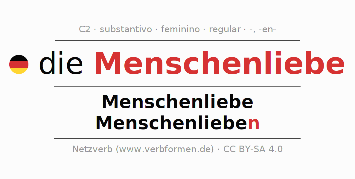 Declinação de Menschenliebe é apresentada em uma tabela com todas as formas no singular e no plural (plural) e em todos os quatro casos: nominativo (1º caso), genitivo (2º caso), dativo (3º caso) e acusativo (4º caso) . Especialmente para os alunos de alemão, a correta declinação da palavra Menschenliebe é fundamental.