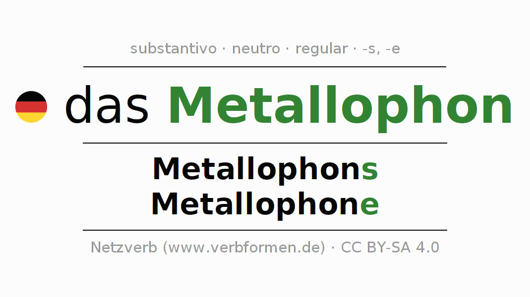 Declinação de Metallophon é apresentada em uma tabela com todas as formas no singular e no plural (plural) e em todos os quatro casos: nominativo (1º caso), genitivo (2º caso), dativo (3º caso) e acusativo (4º caso) . Especialmente para os alunos de alemão, a correta declinação da palavra Metallophon é fundamental.