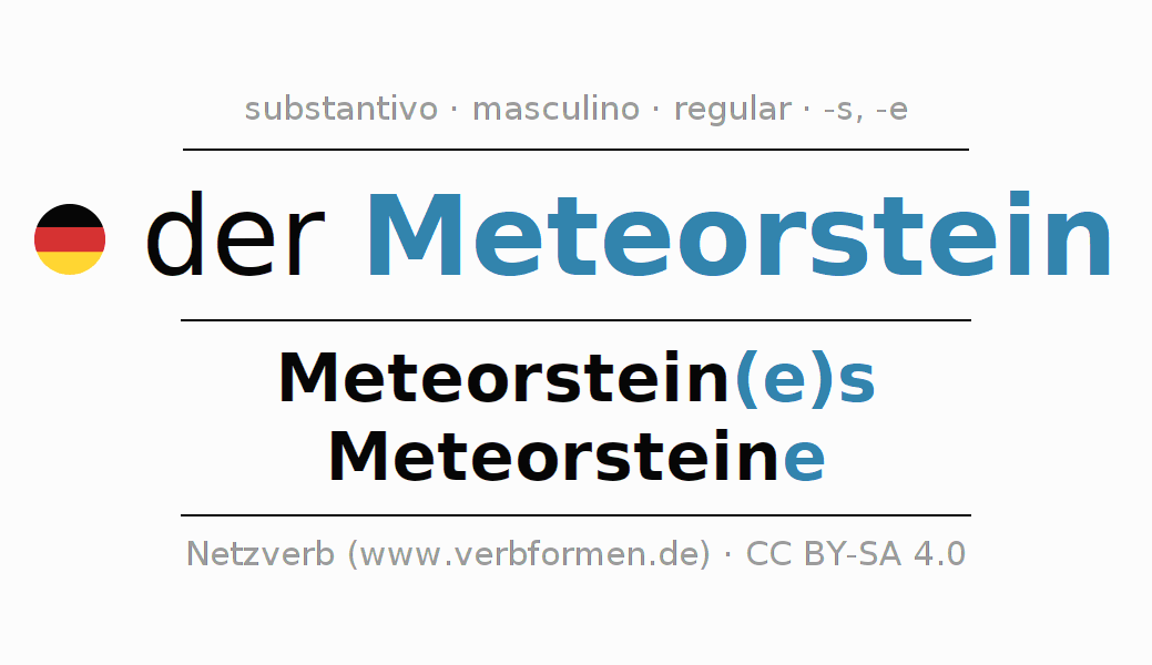 A declinação do substantivo Meteorstein está no genitivo singular Meteorstein(e)s e no nominativo plural Meteorsteine . O substantivo forte Meteorstein é declinado com a terminação es/e. O gênero gramatical de Meteorstein é masculino e o artigo definido é 'der'. Não se pode somente declinar o substantivo Meteorstein mas sim todos os substantivos em alemão. Comentários ☆