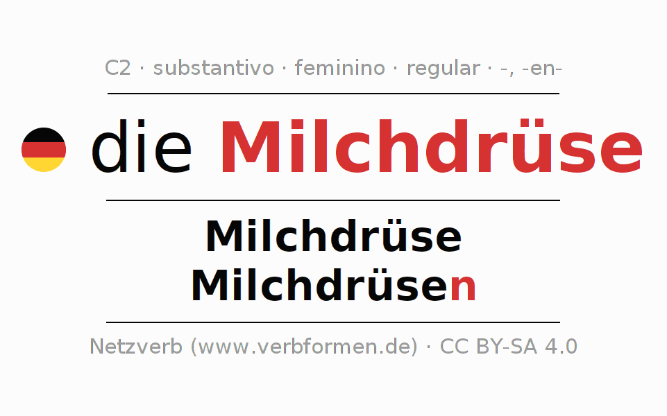 Declinação de Milchdrüse é apresentada em uma tabela com todas as formas no singular e no plural (plural) e em todos os quatro casos: nominativo (1º caso), genitivo (2º caso), dativo (3º caso) e acusativo (4º caso) . Especialmente para os alunos de alemão, a correta declinação da palavra Milchdrüse é fundamental.