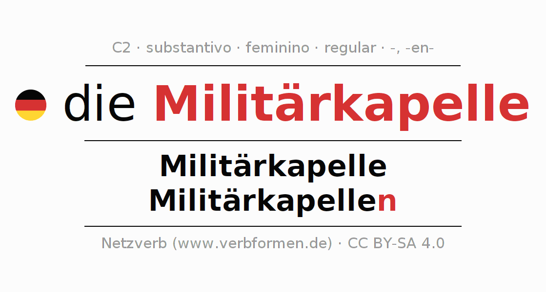 Declinação de Militärkapelle é apresentada em uma tabela com todas as formas no singular e no plural (plural) e em todos os quatro casos: nominativo (1º caso), genitivo (2º caso), dativo (3º caso) e acusativo (4º caso) . Especialmente para os alunos de alemão, a correta declinação da palavra Militärkapelle é fundamental.