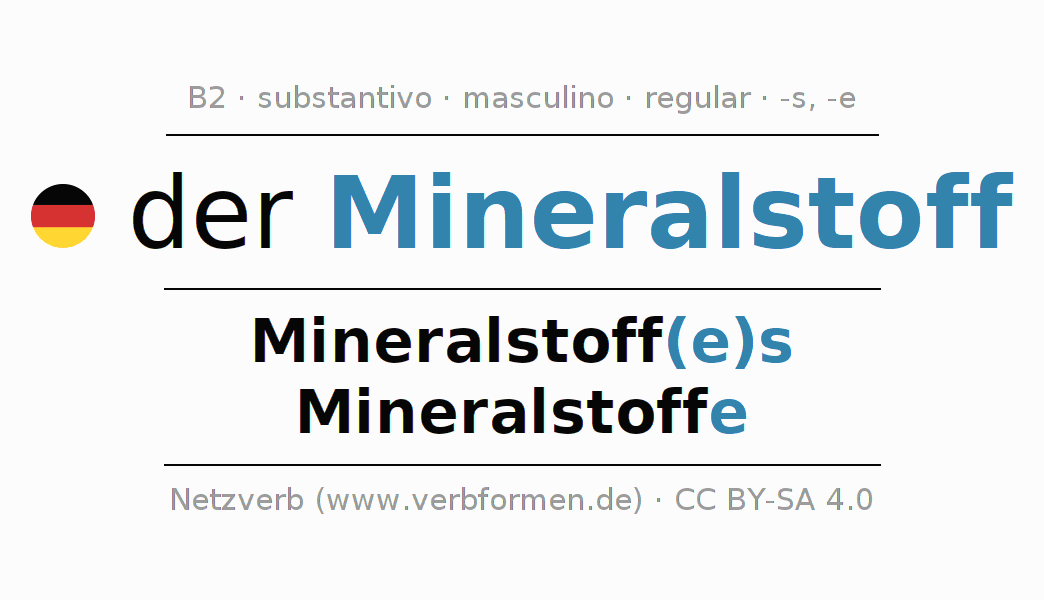 Declinação de Mineralstoff é apresentada em uma tabela com todas as formas no singular e no plural (plural) e em todos os quatro casos: nominativo (1º caso), genitivo (2º caso), dativo (3º caso) e acusativo (4º caso) . Especialmente para os alunos de alemão, a correta declinação da palavra Mineralstoff é fundamental.