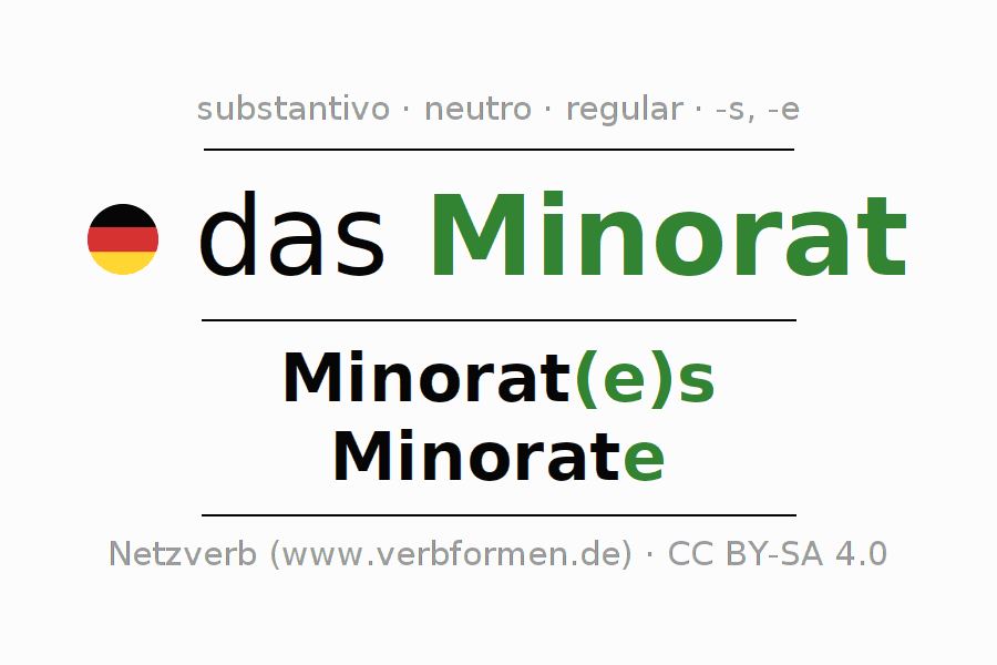 Declinação de Minorat é apresentada em uma tabela com todas as formas no singular e no plural (plural) e em todos os quatro casos: nominativo (1º caso), genitivo (2º caso), dativo (3º caso) e acusativo (4º caso) . Especialmente para os alunos de alemão, a correta declinação da palavra Minorat é fundamental.