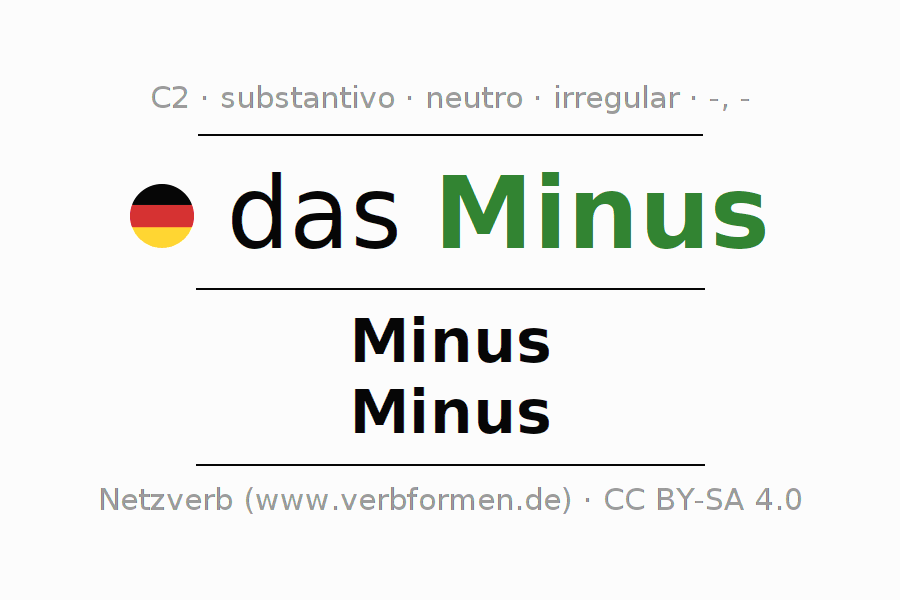 Declinação de Minus é apresentada em uma tabela com todas as formas no singular e no plural (plural) e em todos os quatro casos: nominativo (1º caso), genitivo (2º caso), dativo (3º caso) e acusativo (4º caso) . Especialmente para os alunos de alemão, a correta declinação da palavra Minus é fundamental.