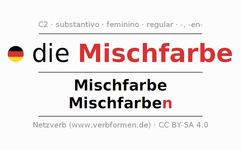 Declinação de Mischfarbe é apresentada em uma tabela com todas as formas no singular e no plural (plural) e em todos os quatro casos: nominativo (1º caso), genitivo (2º caso), dativo (3º caso) e acusativo (4º caso) . Especialmente para os alunos de alemão, a correta declinação da palavra Mischfarbe é fundamental.