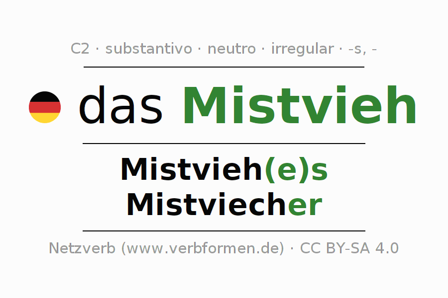 A declinação do substantivo Mistvieh (bicho maldito, bosta) está no genitivo singular Mistvieh(e)s e no nominativo plural - . O substantivo Mistvieh é declinado com as terminações es/s/-. Não há formas no plural. No plural, no entanto, as formas de Mistviech são possíveis. O gênero gramatical de Mistvieh é neutro e o artigo definido é "das". Não se pode somente declinar o substantivo Mistvieh mas sim todos os substantivos em alemão. O substantivo faz parte do vocabulário referente ao Certificado em Alemão do Nível C2. Comentários ☆