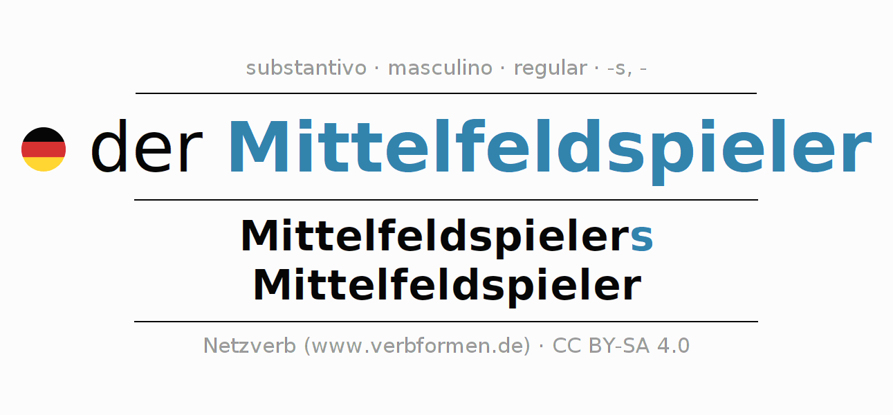 A declinação do substantivo Mittelfeldspieler (meio-campista, jogador de meio-campo) está no genitivo singular Mittelfeldspielers e no nominativo plural Mittelfeldspieler . O substantivo forte Mittelfeldspieler é declinado com a terminação s/-. O gênero gramatical de Mittelfeldspieler é masculino e o artigo definido é 'der'. Não se pode somente declinar o substantivo Mittelfeldspieler mas sim todos os substantivos em alemão. Comentários ☆