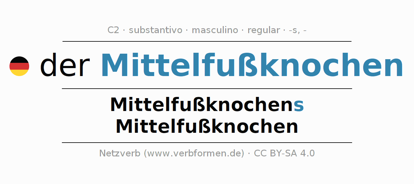 Declinação de Mittelfußknochen é apresentada em uma tabela com todas as formas no singular e no plural (plural) e em todos os quatro casos: nominativo (1º caso), genitivo (2º caso), dativo (3º caso) e acusativo (4º caso) . Especialmente para os alunos de alemão, a correta declinação da palavra Mittelfußknochen é fundamental.