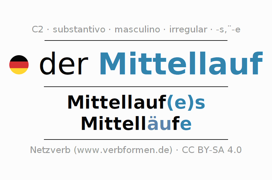 Declinação de Mittellauf é apresentada em uma tabela com todas as formas no singular e no plural (plural) e em todos os quatro casos: nominativo (1º caso), genitivo (2º caso), dativo (3º caso) e acusativo (4º caso) . Especialmente para os alunos de alemão, a correta declinação da palavra Mittellauf é fundamental.