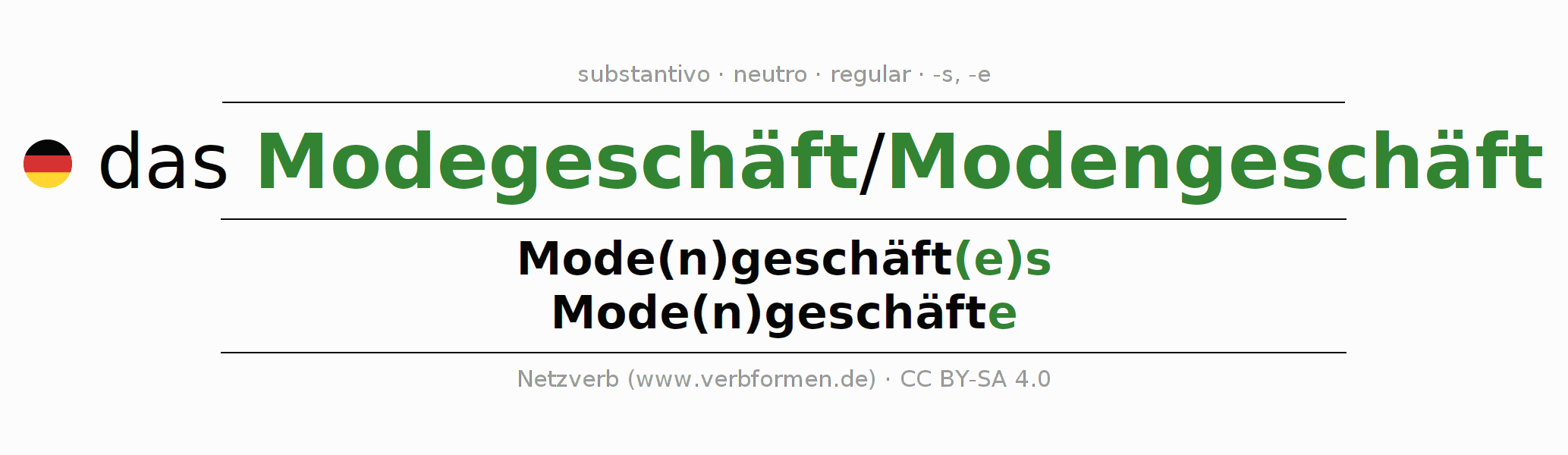 A declinação do substantivo Modegeschäft (butique, loja de roupas) está no genitivo singular Mode(n)geschäft(e)s e no nominativo plural Mode(n)geschäfte . O substantivo forte Modegeschäft é declinado com a terminação es/e. O gênero gramatical de Modegeschäft é neutro e o artigo definido é "das". Não se pode somente declinar o substantivo Modegeschäft mas sim todos os substantivos em alemão. Comentários ☆