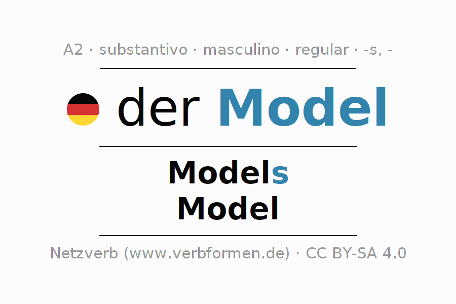 Declinação de Model é apresentada em uma tabela com todas as formas no singular e no plural (plural) e em todos os quatro casos: nominativo (1º caso), genitivo (2º caso), dativo (3º caso) e acusativo (4º caso) . Especialmente para os alunos de alemão, a correta declinação da palavra Model é fundamental.