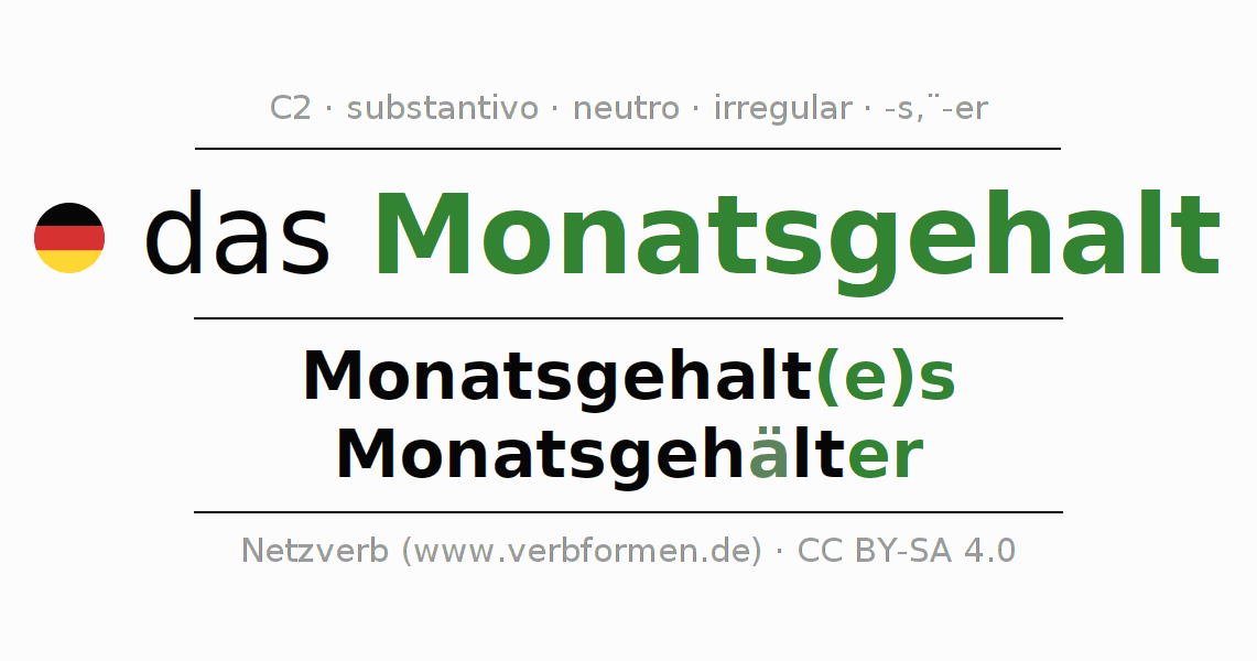 A declinação do substantivo Monatsgehalt (salário mensal, ordenado mensal) está no genitivo singular Monatsgehalt(e)s e no nominativo plural Monatsgehälter . O substantivo forte Monatsgehalt é declinado com a terminação es/ä-er. No plural com um trema. O gênero gramatical de Monatsgehalt é neutro e o artigo definido é "das". Não se pode somente declinar o substantivo Monatsgehalt mas sim todos os substantivos em alemão. O substantivo faz parte do vocabulário referente ao Certificado em Alemão do Nível C2. Comentários ☆