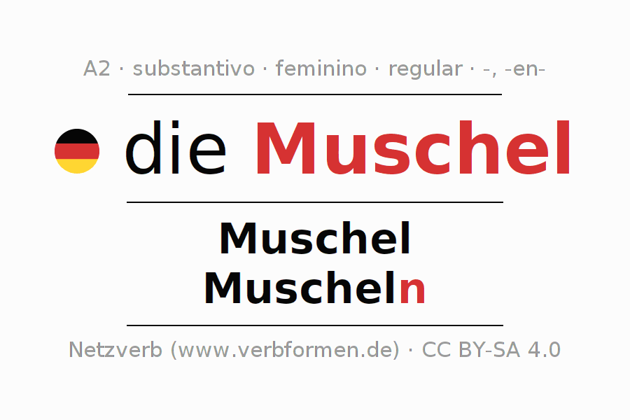 A declinação do substantivo Muschel (concha, marisco) está no genitivo singular Muschel e no nominativo plural Muscheln . O substantivo fraco Muschel é declinado com a terminação -/n. O gênero gramatical de Muschel é feminino e o artigo definido é "die". Não se pode somente declinar o substantivo Muschel mas sim todos os substantivos em alemão. O substantivo faz parte do vocabulário referente ao Certificado em Alemão do Nível A2. Comentários ☆