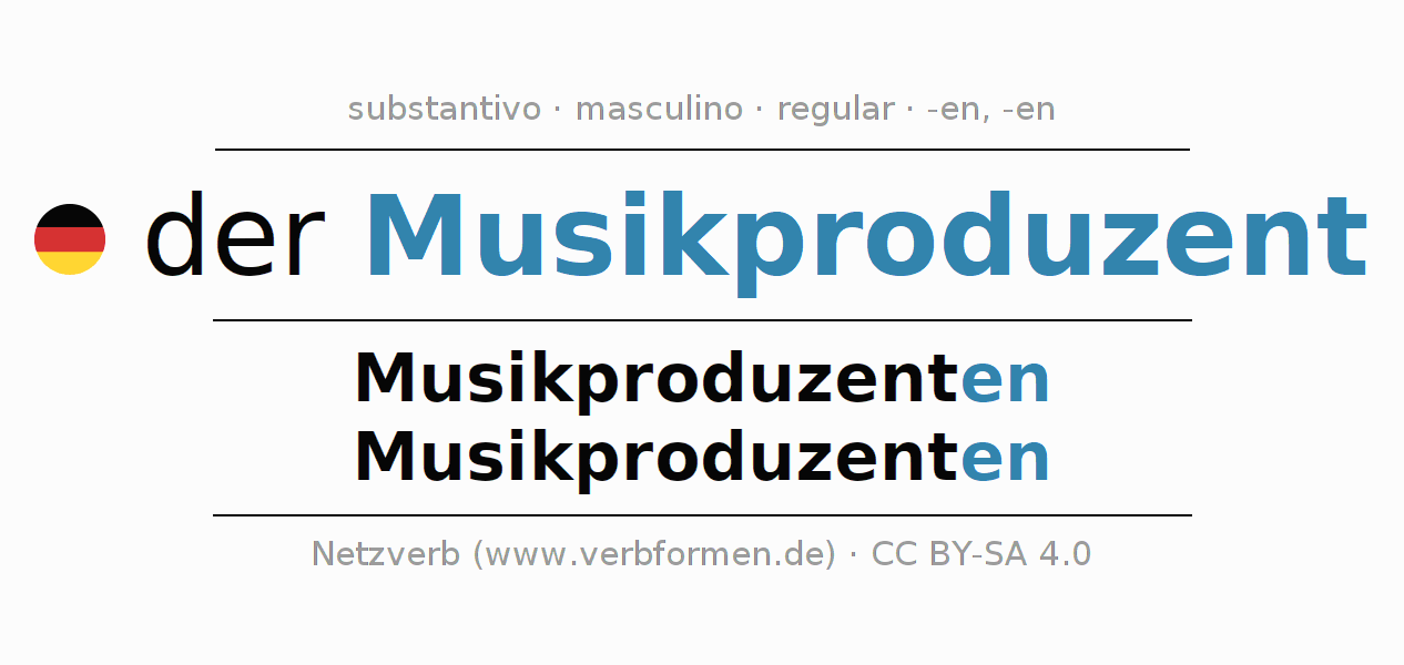 - Singular: der Musikproduzent, des Musikproduzenten, dem Musikproduzenten, den Musikproduzenten