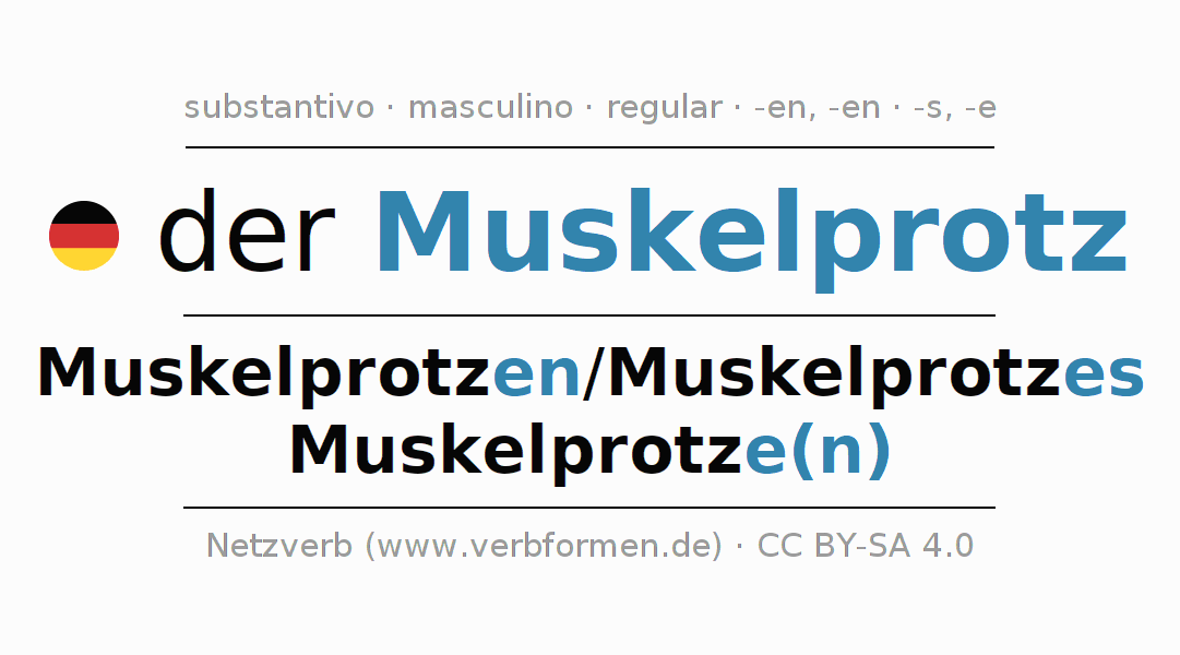 A declinação do substantivo Muskelprotz (exibido, fortão) está no genitivo singular Muskelprotzen/Muskelprotzes e no nominativo plural Muskelprotze(n) . O substantivo fraco Muskelprotz é declinado com a terminação en/es/en/e. O gênero gramatical de Muskelprotz é masculino e o artigo definido é 'der'. Não se pode somente declinar o substantivo Muskelprotz mas sim todos os substantivos em alemão. Comentários ☆