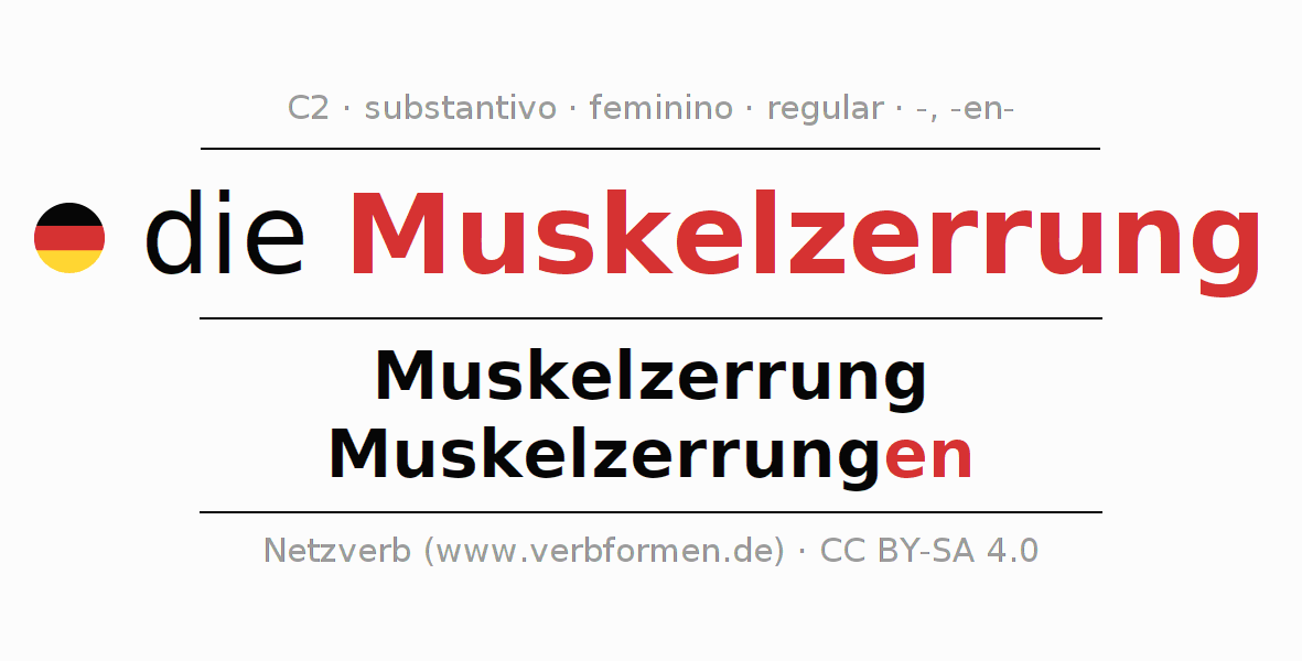 A declinação do substantivo Muskelzerrung (distensão muscular, estiramento muscular) está no genitivo singular Muskelzerrung e no nominativo plural Muskelzerrungen . O substantivo fraco Muskelzerrung é declinado com a terminação -/en. O gênero gramatical de Muskelzerrung é feminino e o artigo definido é "die". Não se pode somente declinar o substantivo Muskelzerrung mas sim todos os substantivos em alemão. O substantivo faz parte do vocabulário referente ao Certificado em Alemão do Nível C2. Comentários ☆