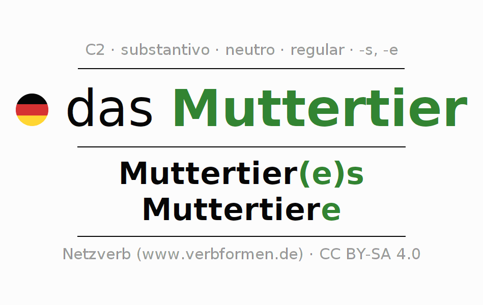 Declinação de Muttertier é apresentada em uma tabela com todas as formas no singular e no plural (plural) e em todos os quatro casos: nominativo (1º caso), genitivo (2º caso), dativo (3º caso) e acusativo (4º caso) . Especialmente para os alunos de alemão, a correta declinação da palavra Muttertier é fundamental.