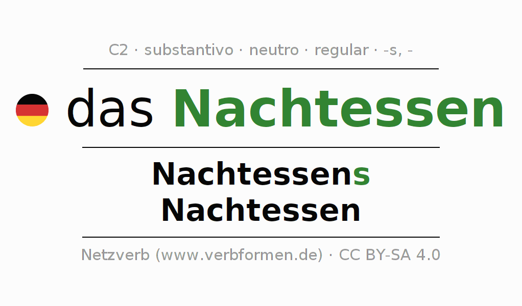Declinação de Nachtessen é apresentada em uma tabela com todas as formas no singular e no plural (plural) e em todos os quatro casos: nominativo (1º caso), genitivo (2º caso), dativo (3º caso) e acusativo (4º caso) . Especialmente para os alunos de alemão, a correta declinação da palavra Nachtessen é fundamental.