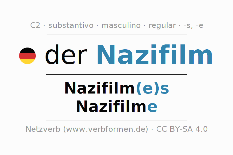 Declinação de Nazifilm é apresentada em uma tabela com todas as formas no singular e no plural (plural) e em todos os quatro casos: nominativo (1º caso), genitivo (2º caso), dativo (3º caso) e acusativo (4º caso) . Especialmente para os alunos de alemão, a correta declinação da palavra Nazifilm é fundamental.