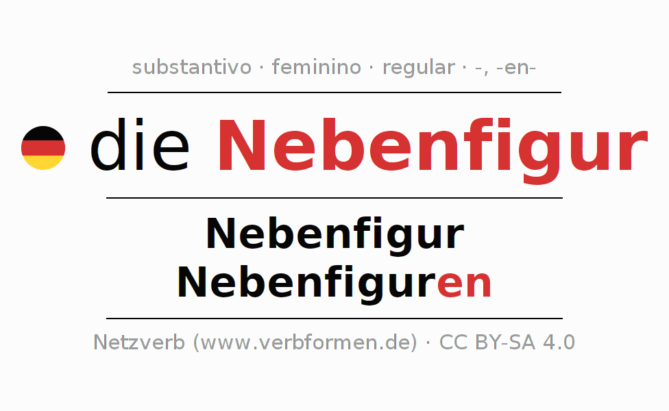 Declinação de Nebenfigur é apresentada em uma tabela com todas as formas no singular e no plural (plural) e em todos os quatro casos: nominativo (1º caso), genitivo (2º caso), dativo (3º caso) e acusativo (4º caso) . Especialmente para os alunos de alemão, a correta declinação da palavra Nebenfigur é fundamental.