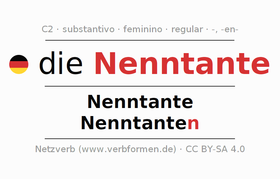 Declinação de Nenntante é apresentada em uma tabela com todas as formas no singular e no plural (plural) e em todos os quatro casos: nominativo (1º caso), genitivo (2º caso), dativo (3º caso) e acusativo (4º caso) . Especialmente para os alunos de alemão, a correta declinação da palavra Nenntante é fundamental.