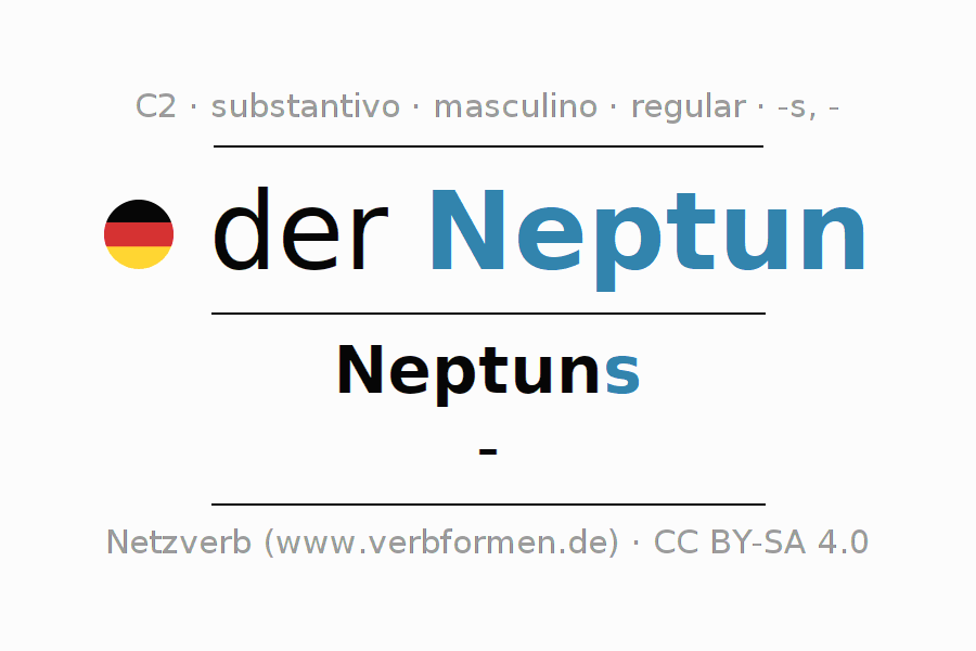 A declinação do substantivo Neptun (Neptuno, Netuno) está no genitivo singular Neptuns e no nominativo plural - . O substantivo forte Neptun é declinado com a terminação s/-. Não há formas no plural. O gênero gramatical de Neptun é masculino e o artigo definido é 'der'. Não se pode somente declinar o substantivo Neptun mas sim todos os substantivos em alemão. O substantivo faz parte do vocabulário referente ao Certificado em Alemão do Nível C2. Comentários ☆