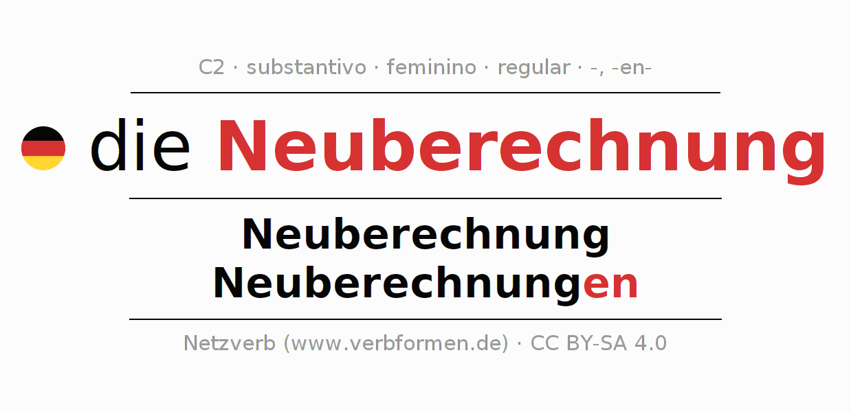 - Plural: die Neuberechnungen, der Neuberechnungen, den Neuberechnungen, die Neuberechnungen