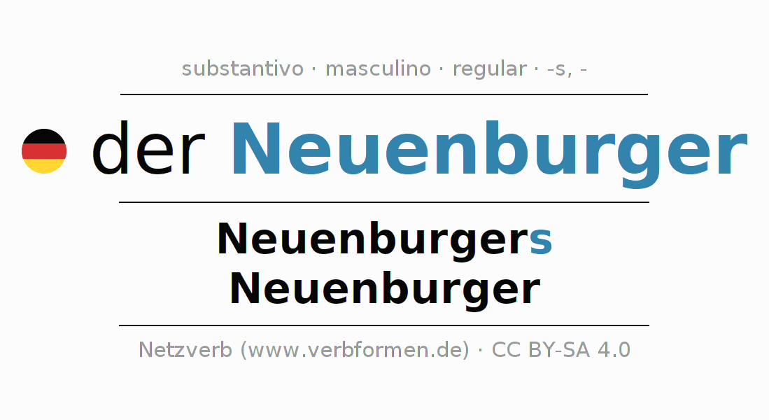 A declinação do substantivo Neuenburger está no genitivo singular Neuenburgers e no nominativo plural Neuenburger . O substantivo forte Neuenburger é declinado com a terminação s/-. O gênero gramatical de Neuenburger é masculino e o artigo definido é 'der'. Não se pode somente declinar o substantivo Neuenburger mas sim todos os substantivos em alemão. Comentários ☆