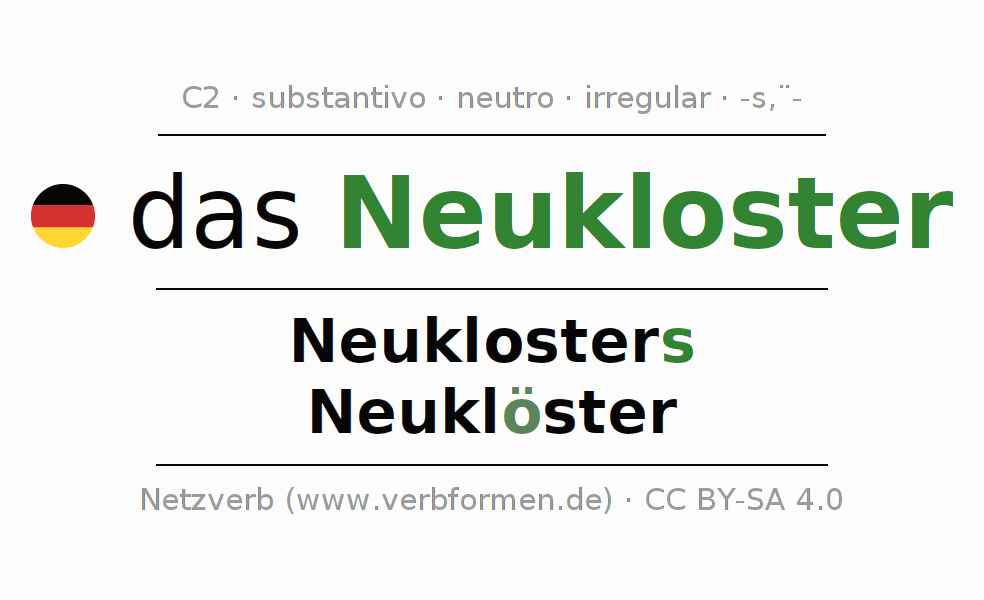 A declinação do substantivo Neukloster (cidade) está no genitivo singular Neuklosters e no nominativo plural Neuklöster . O substantivo forte Neukloster é declinado com a terminação s/ö-. No plural com um trema. O gênero gramatical de Neukloster é neutro e o artigo definido é "das". Não se pode somente declinar o substantivo Neukloster mas sim todos os substantivos em alemão. O substantivo faz parte do vocabulário referente ao Certificado em Alemão do Nível C2. Comentários ☆