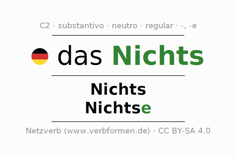 Declinação de Nichts é apresentada em uma tabela com todas as formas no singular e no plural (plural) e em todos os quatro casos: nominativo (1º caso), genitivo (2º caso), dativo (3º caso) e acusativo (4º caso) . Especialmente para os alunos de alemão, a correta declinação da palavra Nichts é fundamental.