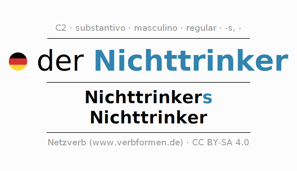 Declinação de Nichttrinker é apresentada em uma tabela com todas as formas no singular e no plural (plural) e em todos os quatro casos: nominativo (1º caso), genitivo (2º caso), dativo (3º caso) e acusativo (4º caso) . Especialmente para os alunos de alemão, a correta declinação da palavra Nichttrinker é fundamental.