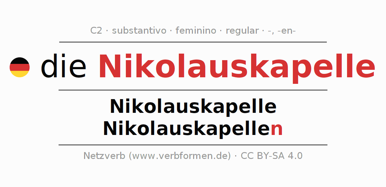 A declinação do substantivo Nikolauskapelle (capela de São Nicolau) está no genitivo singular Nikolauskapelle e no nominativo plural Nikolauskapellen . O substantivo fraco Nikolauskapelle é declinado com a terminação -/n. O gênero gramatical de Nikolauskapelle é feminino e o artigo definido é "die". Não se pode somente declinar o substantivo Nikolauskapelle mas sim todos os substantivos em alemão. O substantivo faz parte do vocabulário referente ao Certificado em Alemão do Nível C2. Comentários ☆