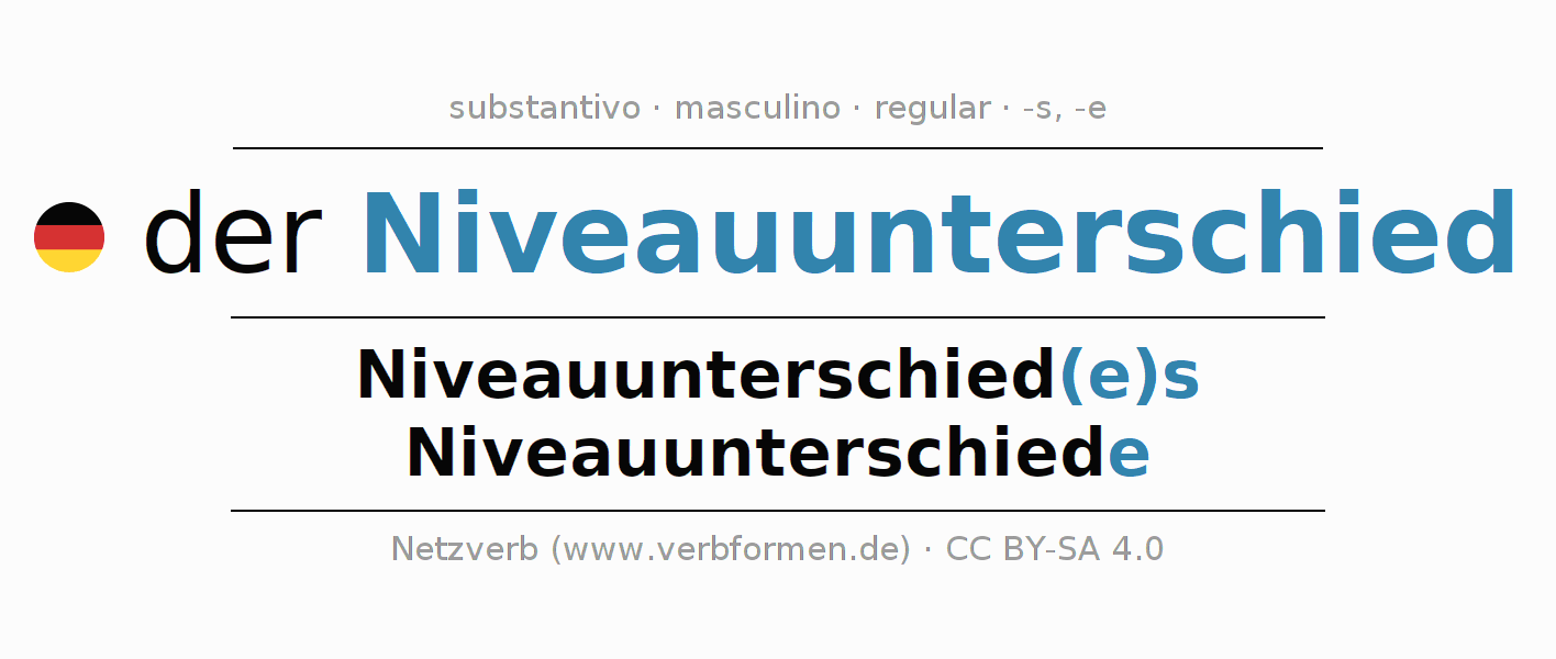 A declinação do substantivo Niveauunterschied (diferença de nível) está no genitivo singular Niveauunterschied(e)s e no nominativo plural Niveauunterschiede . O substantivo forte Niveauunterschied é declinado com a terminação es/e. O gênero gramatical de Niveauunterschied é masculino e o artigo definido é 'der'. Não se pode somente declinar o substantivo Niveauunterschied mas sim todos os substantivos em alemão. Comentários ☆