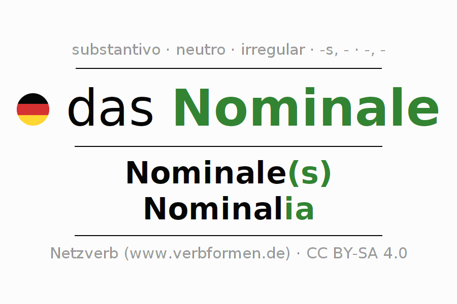 A declinação do substantivo Nominale (valor de face, valor nominal) está no genitivo singular Nominale(s) e no nominativo plural Nominalia . O substantivo Nominale é declinado com as terminações s/-/ia. O gênero gramatical de Nominale é neutro e o artigo definido é "das". Não se pode somente declinar o substantivo Nominale mas sim todos os substantivos em alemão. Comentários ☆