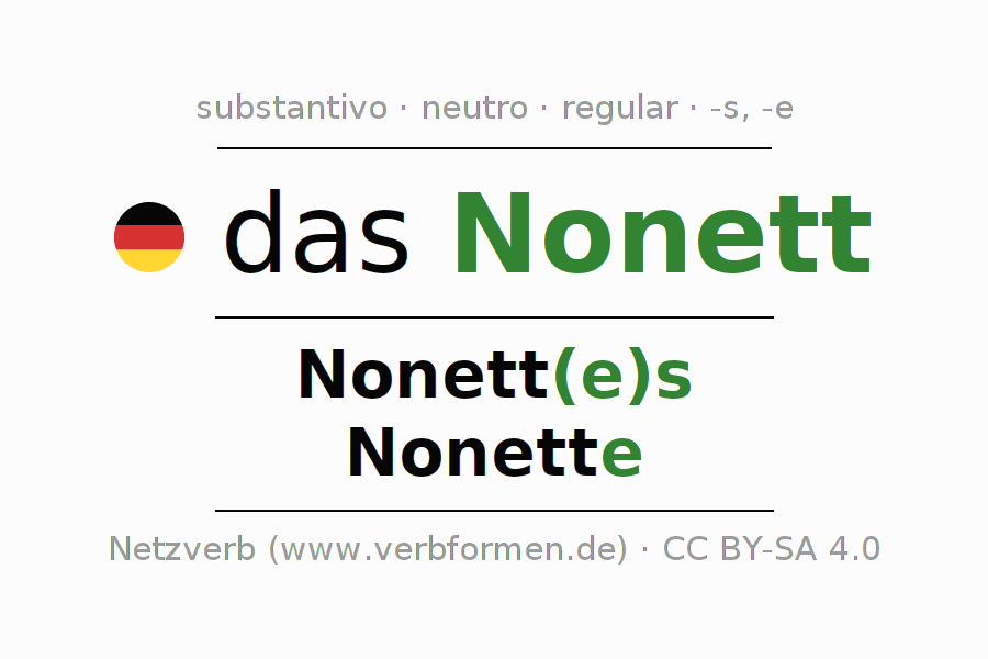 A declinação do substantivo Nonett está no genitivo singular Nonett(e)s e no nominativo plural Nonette . O substantivo forte Nonett é declinado com a terminação es/e. O gênero gramatical de Nonett é neutro e o artigo definido é "das". Não se pode somente declinar o substantivo Nonett mas sim todos os substantivos em alemão. Comentários ☆