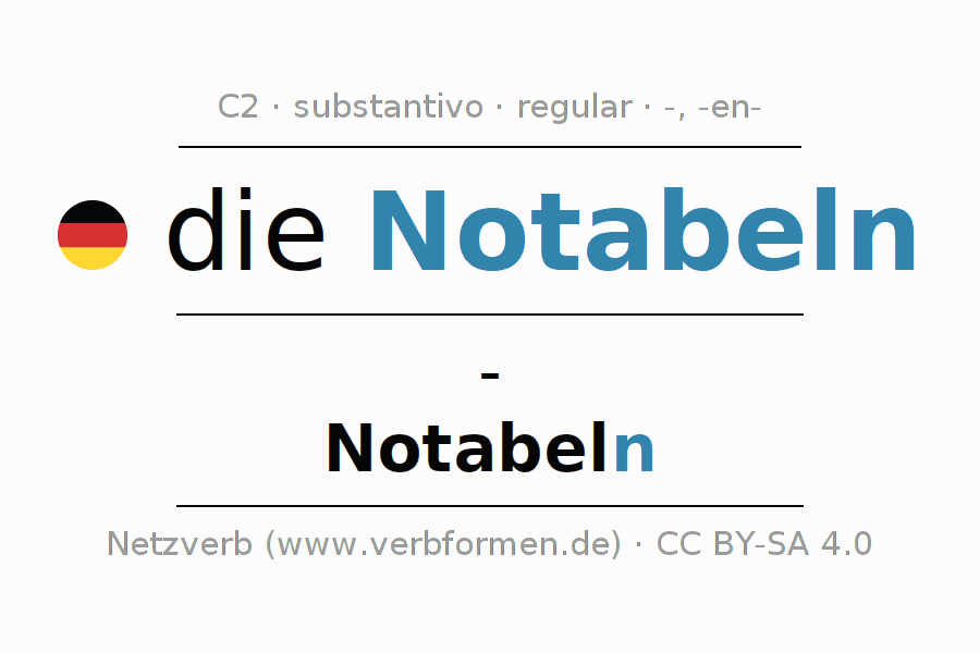 A declinação do substantivo Notabeln (notáveis, pessoas influentes) está no genitivo singular - e no nominativo plural Notabeln . O substantivo misto Notabeln é declinado com a terminação /n. Não há formas no singular. O substantivo também pode ser usado com outros géneros e outros artigos. Não se pode somente declinar o substantivo Notabeln mas sim todos os substantivos em alemão. O substantivo faz parte do vocabulário referente ao Certificado em Alemão do Nível C2. Comentários ☆