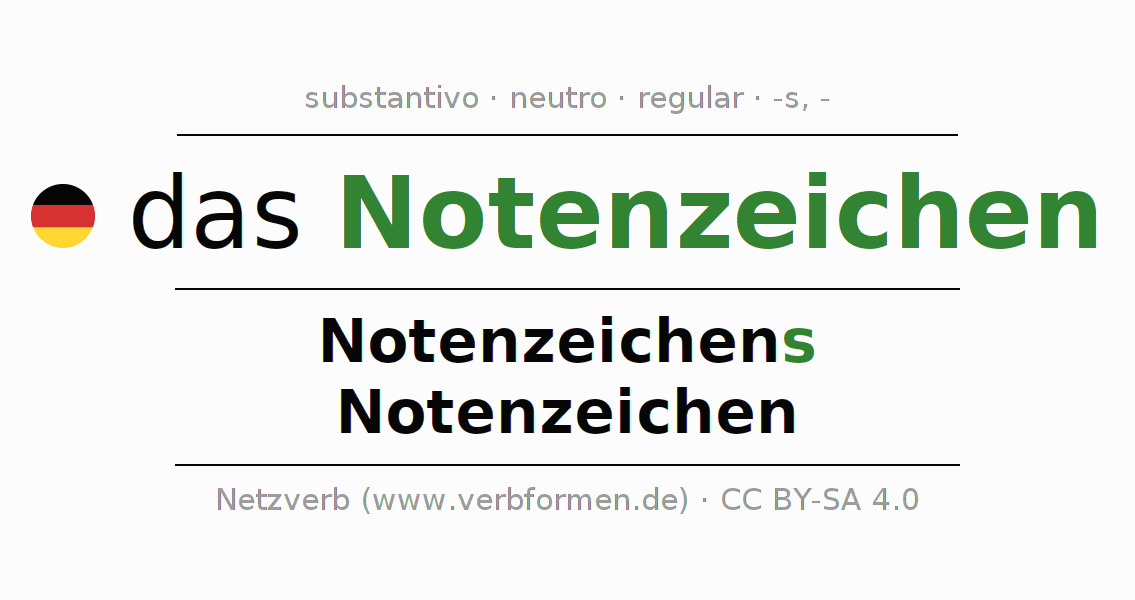 A declinação do substantivo Notenzeichen (símbolo musical) está no genitivo singular Notenzeichens e no nominativo plural Notenzeichen . O substantivo forte Notenzeichen é declinado com a terminação s/-. O gênero gramatical de Notenzeichen é neutro e o artigo definido é "das". Não se pode somente declinar o substantivo Notenzeichen mas sim todos os substantivos em alemão. Comentários ☆